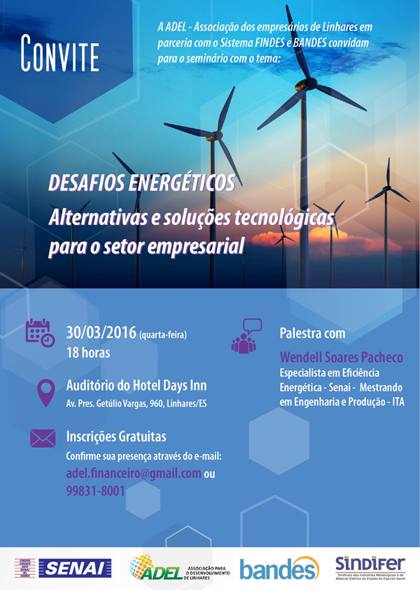 A Diretoria da Findes em Linhares e região, em parceria com a Associação para o Desenvolvimento de Linhares (ADEL) e o Banco de Desenvolvimento do Espírito Santo (Bandes), promoveu na última quarta-feira, dia 30 de abril, o seminário “Desafios Energéticos, Alternativas e Soluções Tecnológicas para o Setor Empresarial”. A palestra, realizada no auditório do Hotel Days Inn, em Linhares, foi ministrada pelo engenheiro especialista em eficiência energética do Senai-ES, Wendell Soares Pacheco.