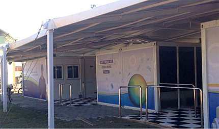 A Escola Móvel Sesi/Senai/IEL conta com módulos educacionais articuláveis, que formam salas de aulas, oficinas e laboratórios. A unidade tem 504m² de área construída e mais 200m² de área externa, com duas tendas que formam as oficinas onde acontecem as aulas práticas, fornecendo toda a infraestrutura necessária para ministrar cursos de qualidade. “O Sistema Findes entra com a estrutura e com os profissionais e a prefeitura arcará com as despesas de manutenção, como água, energia e limpeza, e também com a divulgação dos cursos”, explicou o gerente da unidade de Ações Móveis, Leonardo Leal.